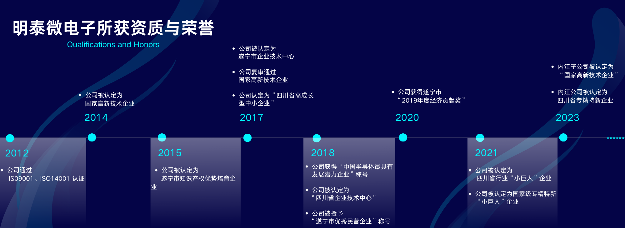 四川明泰電子科技有限公司獲得的資質(zhì)和榮譽(yù) ?2012年,公司通過ISO9001和ISO14001認(rèn)證; 2014年,公司認(rèn)定為“國(guó)家高新技術(shù)企業(yè)”; 2015年,公司認(rèn)定為“遂寧市知識(shí)產(chǎn)權(quán)優(yōu)勢(shì)培育企業(yè)”;